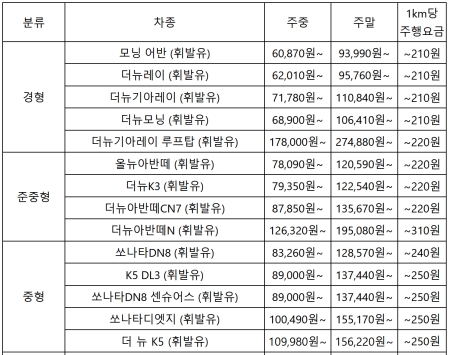 3. 경형부터 중형 세단까지 다양한 차종의 요금을 표에서 확인할 수 있습니다. 예를 들어, 모닝 어반은 주중 약 6만 원대, 더 뉴 K3는 약 7만 9천 원대부터 시작하며, 주말에는 요금이 상향 조정됩니다. 주행요금은 1km당 210원에서 250원 사이로 책정되어 있습니다.