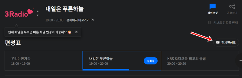 3. 현재 듣고 있는 방송 화면에서 우측을 보면 '전체편성표'라는 항목을 찾을 수 있습니다. 이곳으로 들어가면 현재 방송뿐만 아니라 다른 채널의 전체 프로그램 시간표를 한눈에 확인할 수 있어 편리합니다.
