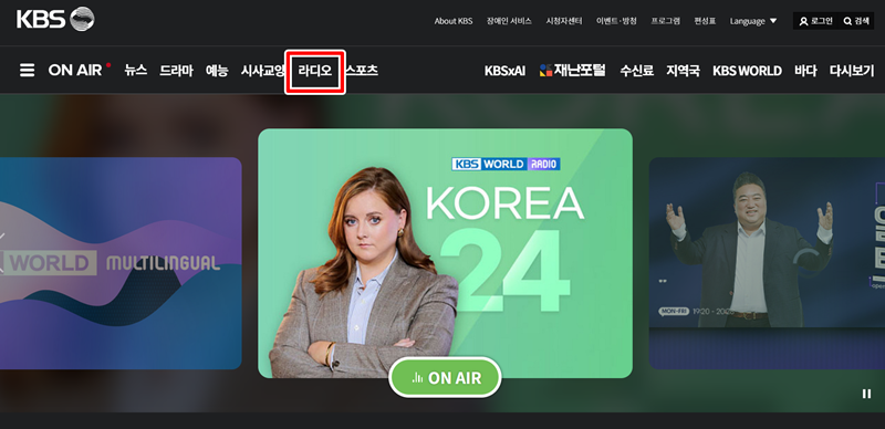 1. 홈페이지에 접속하면 상단 메뉴에서 'ON AIR', '뉴스', '드라마' 등 다양한 항목을 볼 수 있습니다. 여기서 '라디오' 메뉴를 선택하면 실시간으로 방송을 들을 수 있는 페이지로 이동하여 여러 채널의 방송을 만날 수 있습니다.