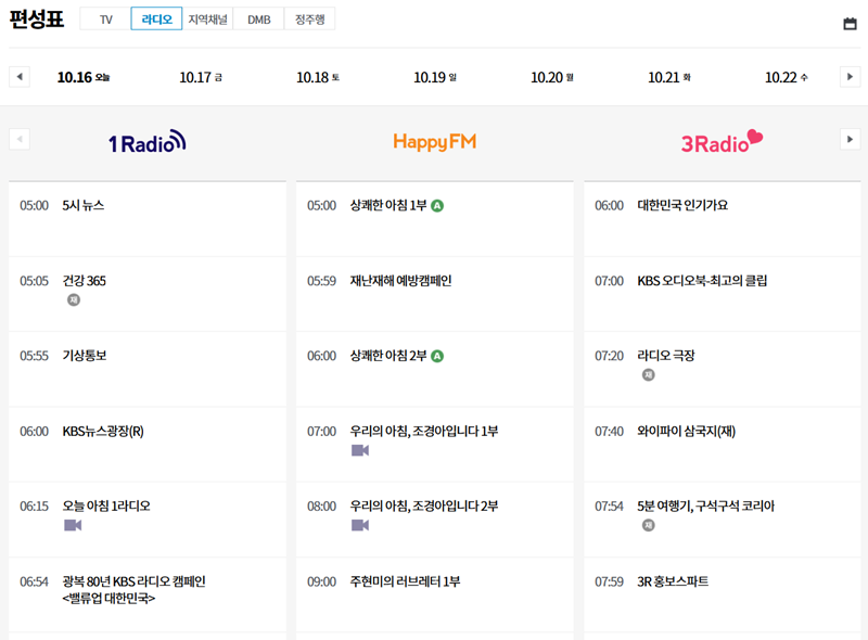 4. 편성표 페이지에서는 1Radio, HappyFM, 3Radio 등 KBS의 모든 라디오 채널별 방송 목록을 날짜별로 조회할 수 있습니다. 이를 통해 원하는 프로그램의 방송 시간을 미리 확인하고 놓치지 않고 챙겨 들을 수 있습니다.