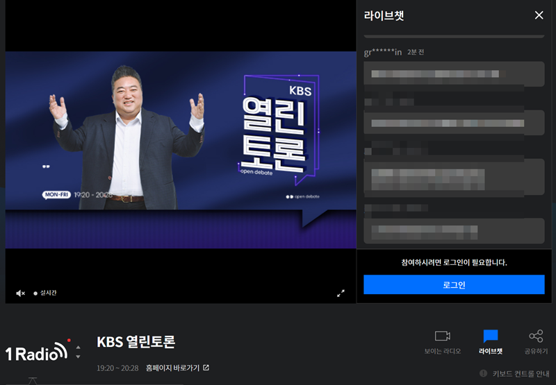 2. 방송을 선택하면 실시간 재생 화면이 나타납니다. 현재 방송 중인 프로그램의 모습과 함께 우측에는 청취자들이 참여할 수 있는 라이브 채팅창이 마련되어 있습니다. 채팅에 참여하기 위해서는 로그인이 필요합니다.
