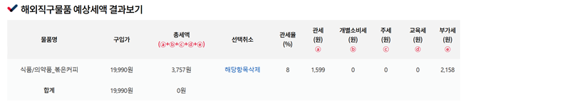 4. 모든 정보를 입력하고 '입력한 예상세액(조회) 추가'를 누르면 하단에 예상 세액 결과가 나타납니다. 예를 들어 볶은 커피를 19,990원에 구매했을 경우, 관세 8%가 적용되어 1,599원의 관세와 2,158원의 부가세가 발생하는 식으로 각 세금 항목별 금액을 상세히 확인할 수 있습니다.