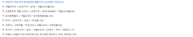 5. 예상 세액 결과표 아래에서는 각 세금이 어떻게 계산되는지에 대한 산출식을 볼 수 있어요. 개별소비세, 주세, 교육세, 부가세 등 복잡한 세금 계산 방식을 참고할 수 있으며, 150달러 이하 자가사용물품은 관세와 부가세 등이 면제된다는 중요한 정보도 안내되어 있습니다.