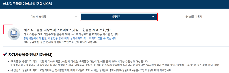 1. 관세청 홈페이지의 '해외직구물품 예상세액 조회시스템'에 접속하면 가장 먼저 조회할 항목을 선택해야 해요. 우리는 해외직구를 할 예정이니, '여행자 휴대품', '해외직구', '이사화물 자동차' 중에서 '해외직구'를 선택하여 다음 단계로 넘어갑니다.