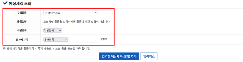 3. 이제 본격적으로 예상 세액을 조회하기 위해 구매한 물품의 정보를 입력할 차례입니다. '구입물품' 항목에서 구매한 상품의 종류를 선택하고, '총과세가격'에는 물품 가격과 국제 배송비, 그 외 비용을 모두 더한 총액을 원화(KRW)로 입력해 주세요.
