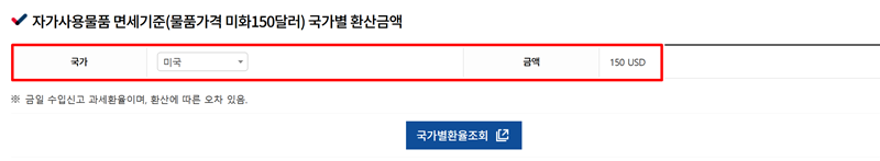 2. 다음으로 자가사용물품의 면세 기준을 확인하는 단계예요. 물품을 구매한 국가를 선택하면 해당 국가의 면세 한도 금액이 표시됩니다. 예를 들어 미국을 선택하면 미화 150달러로 나타나는데, 목록통관의 경우 미국에서 오는 물품은 200달러까지 면세 대상이 됩니다.