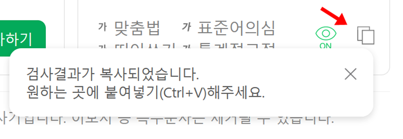 5. 올바르게 수정된 문장이 마음에 든다면, 눈 모양 아이콘 옆의 복사 모양을 눌러주세요. '검사 결과가 복사되었습니다'라는 안내 창이 뜨면서 교정된 내용 전체가 클립보드에 저장되어 원하는 곳에 바로 붙여넣을 수 있습니다.