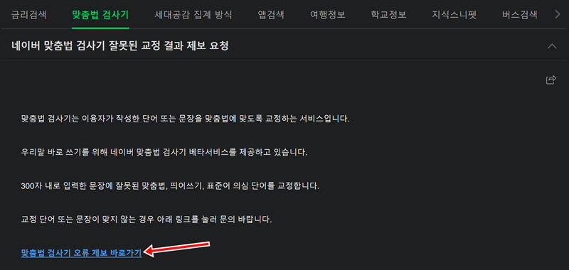 6. 만약 맞춤법 검사기의 교정 결과가 잘못되었다고 생각된다면, 네이버 고객센터를 통해 수정 요청을 할 수 있습니다. '맞춤법 검사기 교정 결과 수정 요청' 항목을 통해 잘못된 맞춤법이나 띄어쓰기 등을 제보할 수 있습니다.