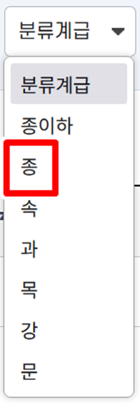4. 바로 옆에 있는 '분류계급' 선택창에서는 '종'을 선택합니다. 과, 목 등 더 넓은 범위 대신 '종'을 선택해야 우리가 흔히 말하는 각각의 새 종류(예: 참새, 꾀꼬리 등) 목록을 확인할 수 있습니다.