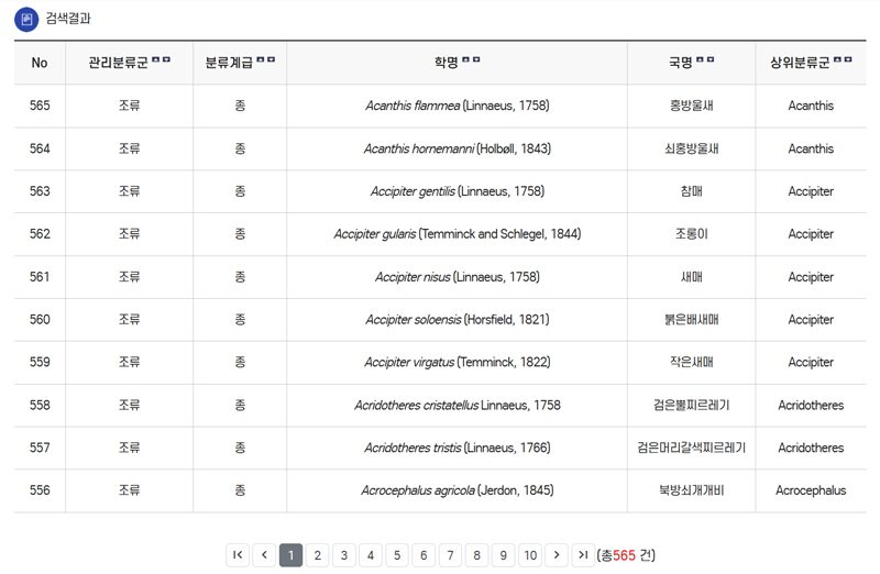 5. 검색을 실행하면 조건에 맞는 조류 목록이 나타납니다. 학명과 국명(우리나라 이름)을 함께 볼 수 있어 편리합니다. 총 565종의 새가 검색된 것을 확인할 수 있으며, 페이지를 넘기며 다양한 새의 이름을 살펴볼 수 있습니다.
