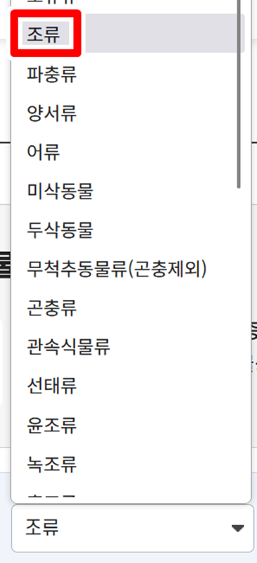 3. 첫 번째 '분류군' 선택창을 열어 다양한 생물 분류 목록 중에서 '조류'를 찾아서 선택해 줍니다. 이렇게 하면 검색 범위가 오직 새 종류에만 한정되어 우리가 원하는 정보를 더 쉽고 정확하게 찾을 수 있습니다.