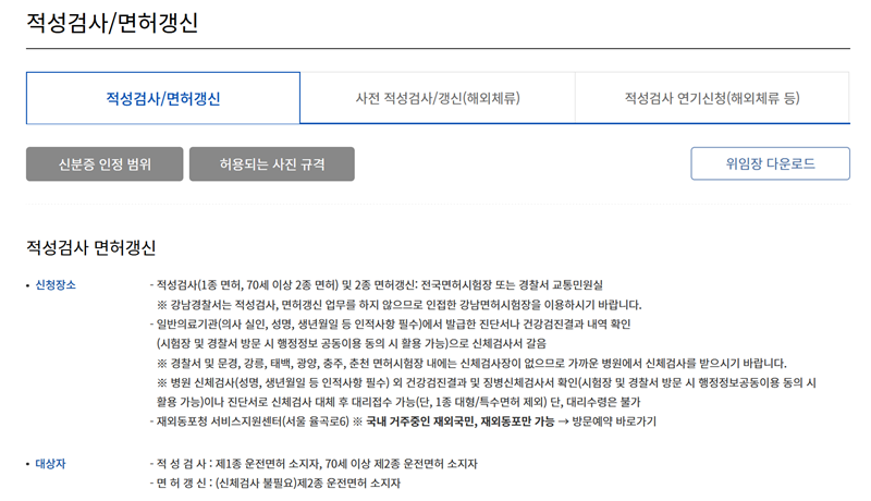 3. 적성검사 및 면허갱신 페이지에서는 신청 장소와 대상자에 대한 안내를 볼 수 있습니다. 전국 운전면허시험장이나 경찰서 민원실에서 신청할 수 있으며, 1종 운전면허 소지자와 70세 이상의 2종 운전면허 소지자가 갱신 대상에 해당됩니다.
