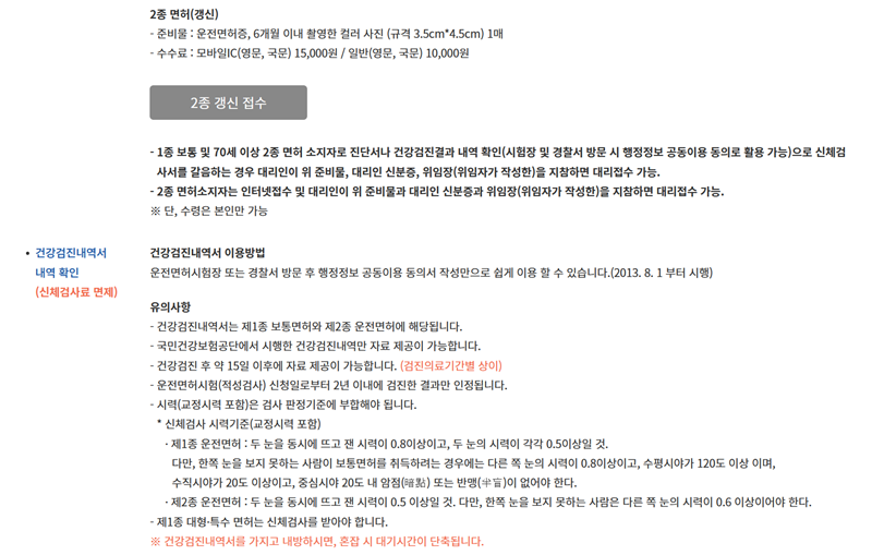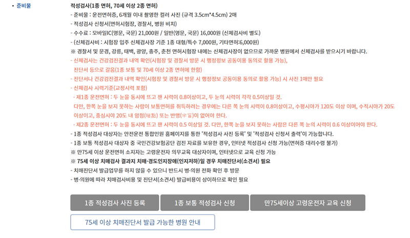 6. 건강검진 결과 내역을 활용하면 신체검사를 대체할 수 있어 편리합니다. 운전면허 적성검사는 시력 기준을 충족해야 하는데, 1종 면허는 두 눈을 동시에 뜨고 잰 시력이 0.8 이상, 각 눈의 시력이 0.5 이상이어야 하는 등 면허 종류에 따른 기준을 확인해야 합니다.
