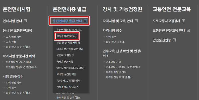 2. 전체 메뉴가 나타나면 '운전면허증 발급' 항목 아래에 있는 '운전면허증 발급 안내'를 선택합니다. 그 속에서 '적성검사/면허갱신'으로 들어가면 갱신 절차에 대한 전반적인 내용을 상세하게 확인할 수 있는 페이지로 이동하게 됩니다.