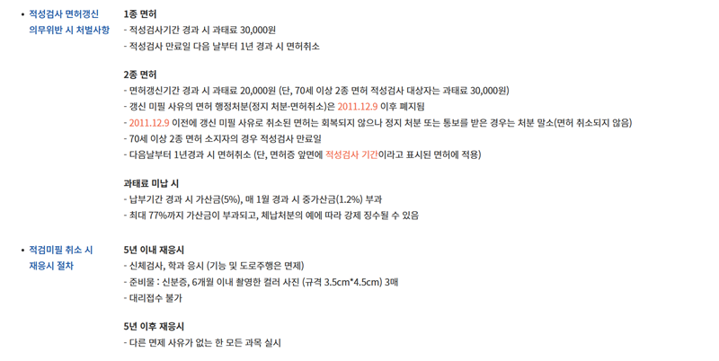 7. 만약 정해진 기간 내에 적성검사나 면허 갱신을 하지 않으면 과태료가 부과됩니다. 1종 면허의 경우, 적성검사 만료일 다음 날부터 1년이 지나면 면허가 취소되므로 갱신 기간을 놓치지 않도록 각별히 유의해야 합니다.