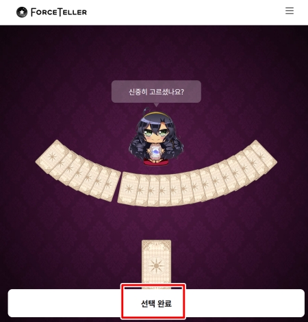 3. 카드를 신중히 고른 후에는 화면 하단에 나타나는 '선택 완료' 부분을 눌러주세요. 이 과정을 통해 당신이 고른 카드가 확정되며, 결과를 보기 위한 다음 단계로 넘어가게 됩니다.