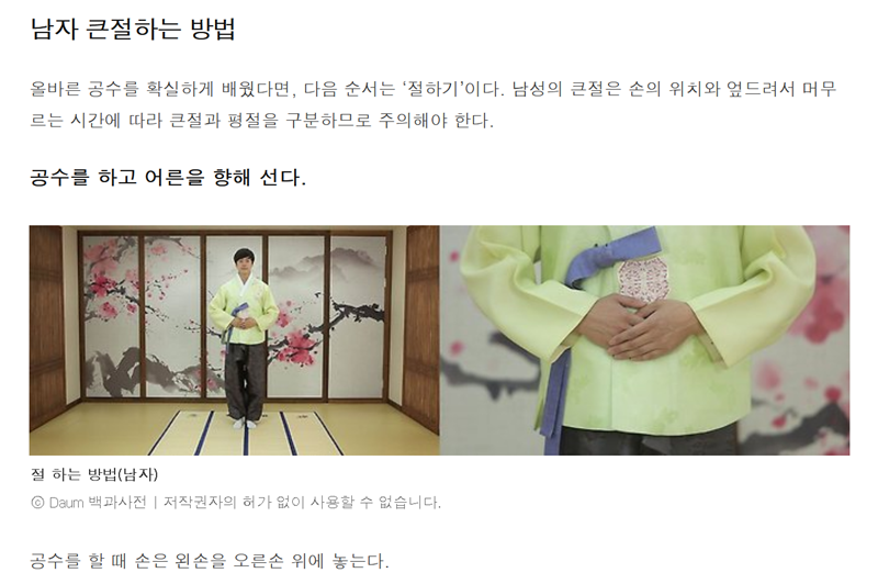 2. 검색창에 '절 하는 방법'을 입력하면, 남성과 여성의 올바른 예법에 대한 글을 각각 찾아볼 수 있습니다. 성별에 따른 차이를 비교하며 확인하는 것이 좋습니다.