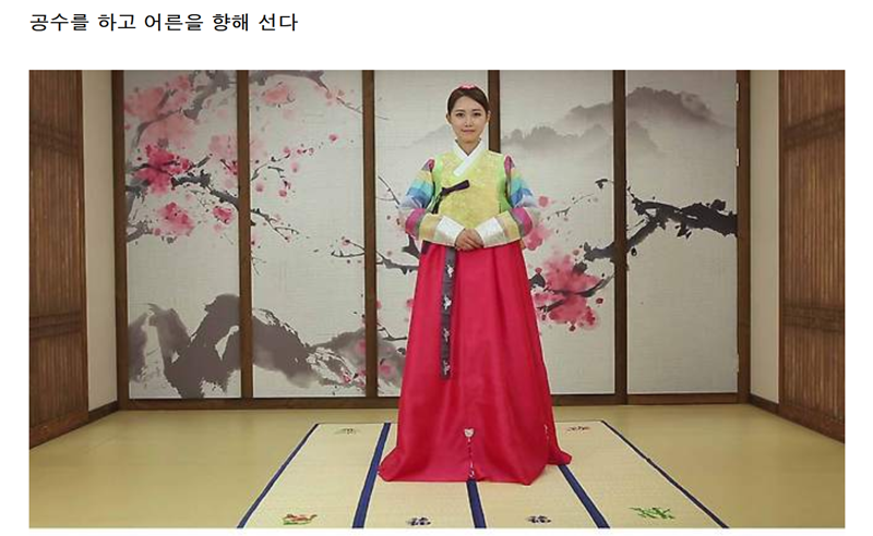 5. 공수한 자세로 어른을 향해 바르게 섭니다. 공경하는 마음을 담아 차분하고 단정한 자세를 유지하는 것이 중요합니다.