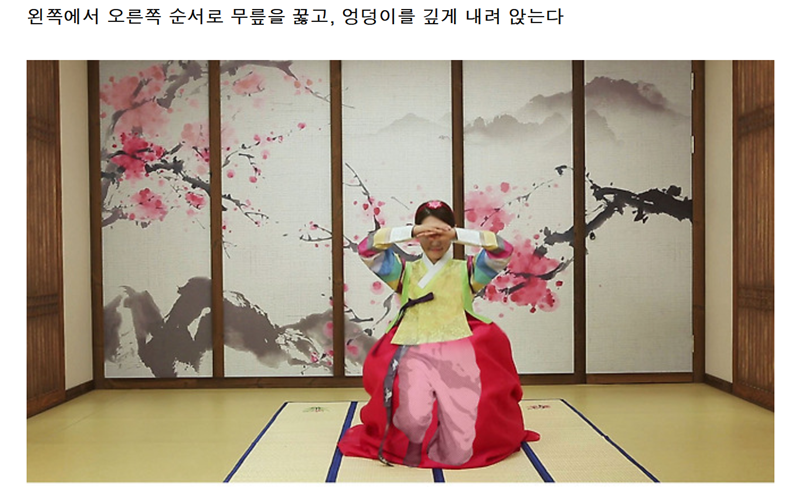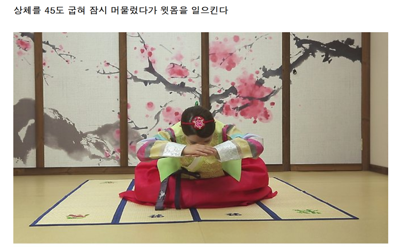 15. 엉덩이를 깊이 내려앉은 후, 팔꿈치를 바닥에 붙이며 이마가 손등에 닿을 정도로 깊이 숙여 절합니다. 조상께 예를 다하는 가장 공손한 자세입니다.