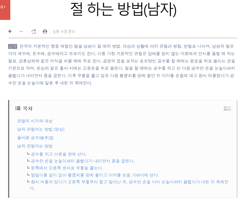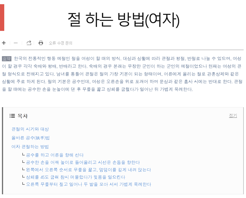 3. 먼저 '절 하는 방법(여자)' 항목을 통해 여성의 예법을 순서대로 알아보겠습니다. 글의 요약과 목차를 통해 전체적인 흐름을 미리 파악할 수 있습니다.