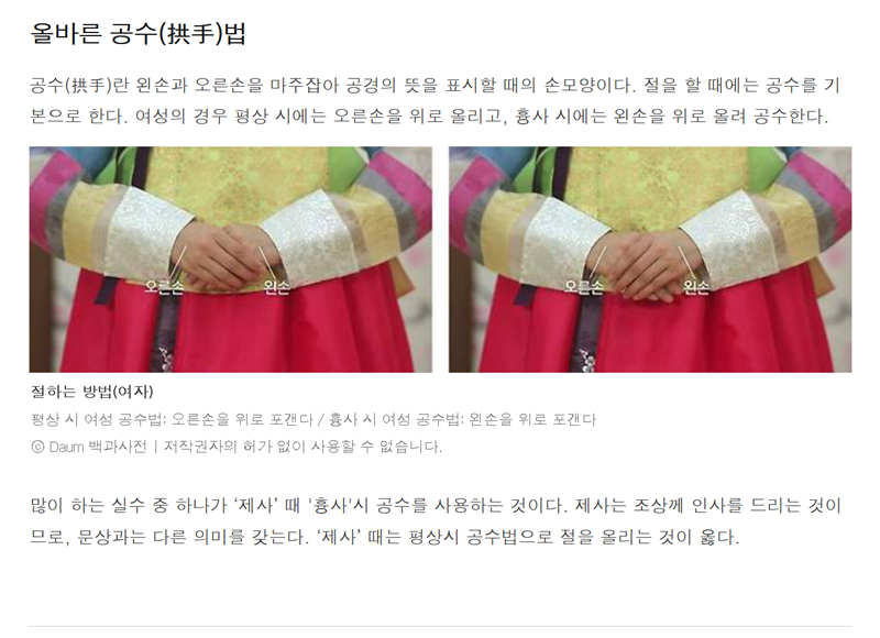 11. 남성 또한 '공수' 자세가 기본입니다. 제사와 같은 길사(吉事)에서는 왼손이 위로 가도록 두 손을 포개 잡습니다. 흉사(凶事)에서는 반대로 오른손이 위로 갑니다.