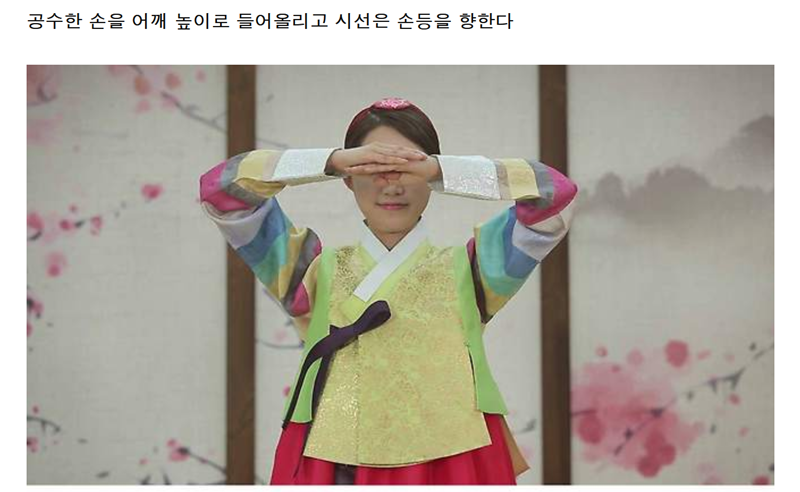 6. 공수한 손을 어깨 높이까지 들어 올립니다. 이때 시선은 자신의 손등을 바라보는 것이 올바른 자세입니다.