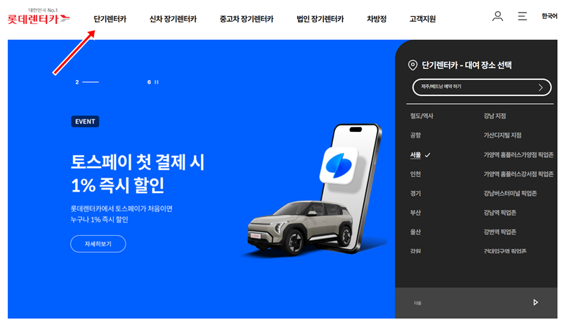 1. 롯데렌터카 홈페이지에 접속하면 가장 먼저 단기렌터카, 신차 장기렌터카 등 다양한 메뉴를 볼 수 있습니다. 여기서 짧은 기간 동안 필요한 차량을 빌리는 경우이므로, 화면 상단 메뉴 중 '단기렌터카'를 선택하여 다음 단계로 이동합니다.