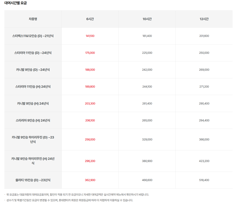 6. 만약 하루가 아닌 몇 시간만 짧게 차량을 이용하고 싶다면, 대여시간별 요금표를 참고하면 됩니다. 쏠라티 15인승 차량을 기준으로 6시간 대여 시 362,900원, 10시간 대여 시 466,600원, 12시간 대여 시 518,400원으로 책정되어 있어 필요한 시간만큼 합리적으로 이용할 수 있습니다.