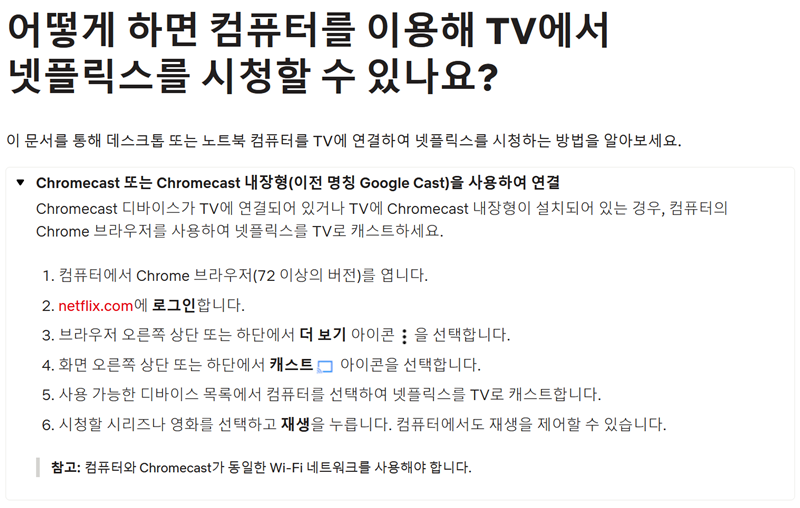 3. 문서에서는 크롬캐스트를 이용한 연결 방법을 안내합니다. 컴퓨터의 크롬 브라우저에서 넷플릭스에 로그인한 뒤, '캐스트' 아이콘을 눌러 TV로 화면을 전송하는 방식입니다. 이때 컴퓨터와 크롬캐스트는 동일한 와이파이에 연결되어 있어야 합니다.