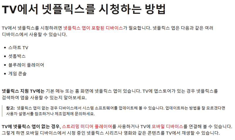 5. 컴퓨터 연결 외에 다른 방법도 있습니다. 'TV에서 넷플릭스를 시청하는 방법' 도움말을 보면, 넷플릭스 앱이 포함된 스마트 TV, 셋톱박스, 게임 콘솔 등 다양한 디바이스를 통해 직접 시청이 가능하다고 안내하고 있습니다.