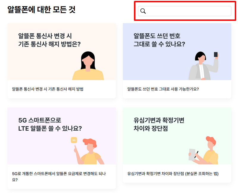 3. '가이드' 페이지는 알뜰폰에 대한 모든 궁금증을 해결해 주는 공간입니다. 상단 검색창을 통해 원하는 정보를 직접 찾아볼 수도 있고, '알뜰폰도 쓰던 번호 그대로 쓸 수 있나요?', '5세대 이동통신 스마트폰으로 4세대 이동통신 알뜰폰 쓸 수 있나요?' 등 많은 사람이 궁금해하는 주제들이 보기 좋게 정리되어 있습니다.