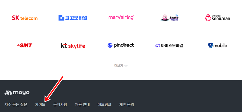 2. 화면을 아래로 쭉 내리면 사이트의 가장 아래쪽 영역을 볼 수 있습니다. 이곳에는 자주 묻는 질문, 공지사항 등 다양한 메뉴가 있는데, 알뜰폰과 자급제폰에 대한 유용한 정보를 얻고 싶다면 '가이드' 항목으로 들어가면 됩니다.