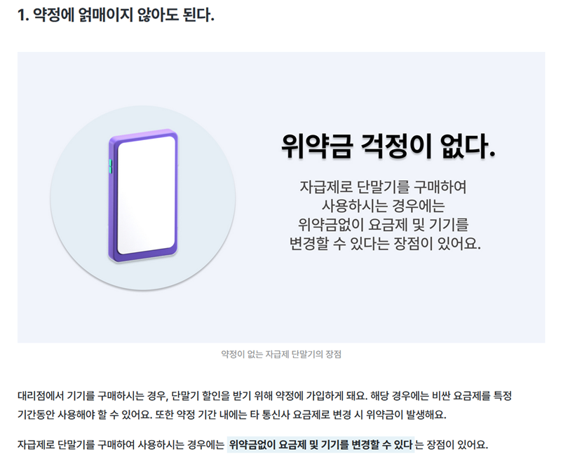 6. 자급제폰의 가장 큰 장점은 바로 '약정에 얽매이지 않아도 된다'는 점입니다. 통신사 약정 없이 기기를 구매하기 때문에 사용 중에 언제든지 다른 요금제로 바꾸거나 새로운 기기로 변경해도 위약금이 발생하지 않는다는 장점이 있어 자유로운 통신 생활이 가능합니다.