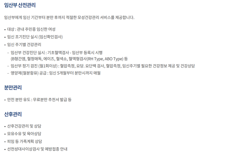 6. 페이지 하단에는 임산부와 신생아를 위한 건강관리 정보가 안내되어 있습니다. 임신 초기부터 분만, 산후조리 기간까지 시기별로 필요한 검사나 지원 내용이 정리되어 있어 함께 읽어보면 유용합니다.