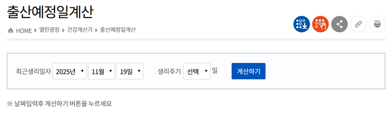 3. 건강계산기 페이지로 이동하면 왼쪽에 세부 메뉴 목록이 나타납니다. 여러 계산 항목 중에서 '출산예정일계산'을 선택하면 날짜를 산출해 볼 수 있는 화면으로 이동하게 됩니다.