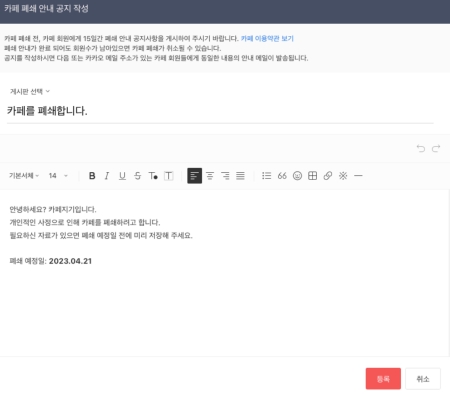 4. 공지 작성 화면에서 카페를 닫는다는 제목과 내용을 적어주세요. 개인적인 사유와 함께 자료를 미리 저장해달라는 안내를 덧붙이면 좋습니다. 폐쇄 예정 날짜도 함께 기입한 후 등록을 완료합니다.