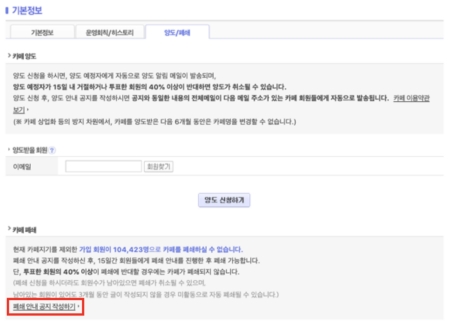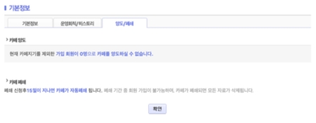 2. 기본정보 화면 상단에 여러 탭이 보일 거예요. 그중에서 '양도/폐쇄'를 선택해 주세요. 이곳에서 카페를 다른 사람에게 넘기거나 완전히 없애는 과정을 진행할 수 있습니다.