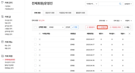 5. 공지 기간 중 회원 관리가 필요할 수 있습니다. '카페 회원' 메뉴의 '전체회원/운영진'으로 들어가면 모든 회원의 목록을 볼 수 있고, 이곳에서 특정 회원을 강제로 탈퇴시키는 등의 조치를 할 수 있습니다.
