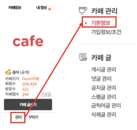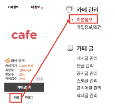 1. 먼저 운영하는 카페에 들어간 뒤 왼쪽 아래에 보이는 '관리'로 들어가 주세요. 다음으로 오른쪽에 나타나는 여러 항목 중에서 '카페 관리' 아래에 있는 '기본정보'를 찾아서 들어가면 됩니다.