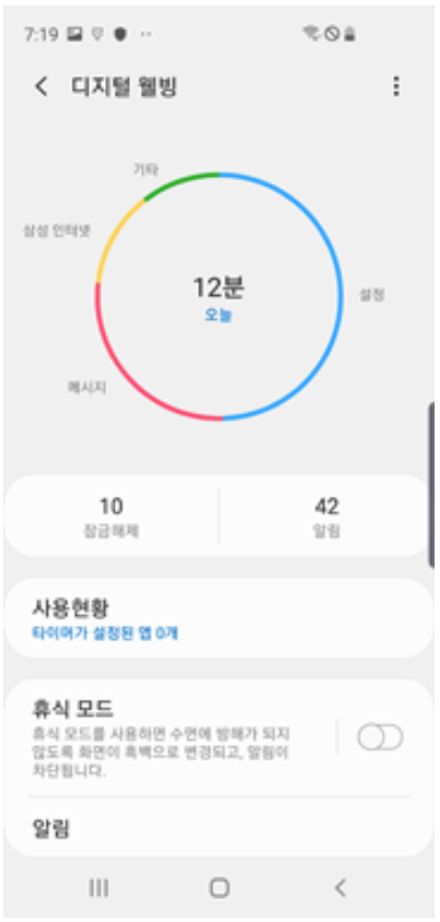 3. '디지털 웰빙' 메뉴로 들어가면 오늘 하루 동안 스마트폰을 사용한 총시간이 원 그래프 형태로 나타납니다. 또한, 화면 잠금을 해제한 횟수나 받은 알림 개수 같은 부가 정보도 함께 살펴볼 수 있어요.