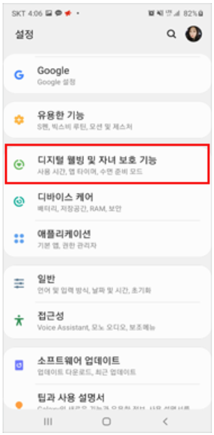 5. 설정 화면에서 아래쪽으로 스크롤하여 '디지털 웰빙 및 자녀 보호 기능' 항목을 선택합니다. 이 메뉴를 통해 나의 스마트폰 사용 패턴에 대한 자세한 정보를 얻을 수 있습니다.