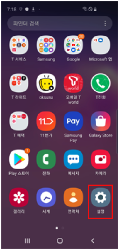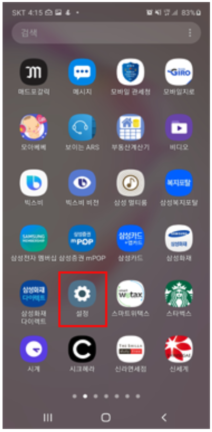 1. 가장 먼저 스마트폰의 모든 앱이 모여있는 화면에서 톱니바퀴 모양의 '설정' 아이콘을 찾아 들어가 주세요. 이곳에서 스마트폰의 모든 기능를 관리할 수 있습니다.