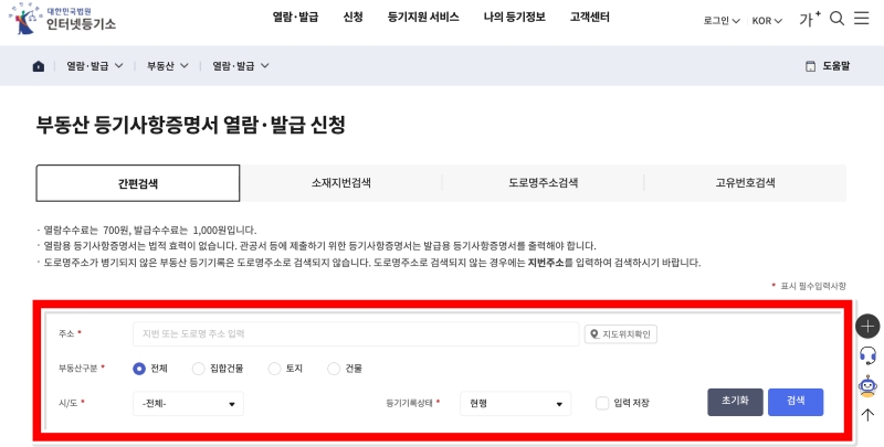 3. 부동산 등기사항증명서 열람 및 발급 신청 화면에서는 주소 검색이 기본입니다. 간편 검색을 통해 주소를 입력하고 부동산 구분을 선택한 뒤 검색하면 원하는 부동산의 등기 정보를 찾을 수 있습니다.