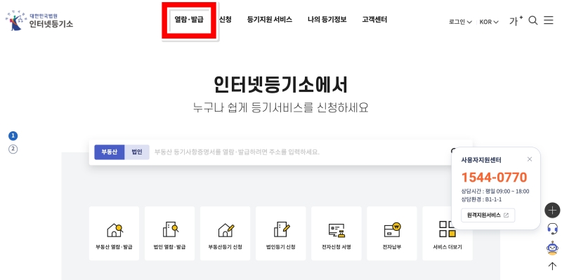 1. 홈페이지 상단 메뉴 중 '열람·발급'을 선택하면 등기 서비스를 이용하기 위한 첫 단계가 시작됩니다. 이곳에서 부동산과 관련된 다양한 민원 서류를 확인하고 신청할 수 있는 기능들이 모여 있어 편리합니다.