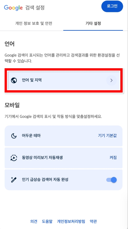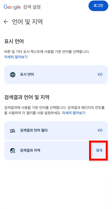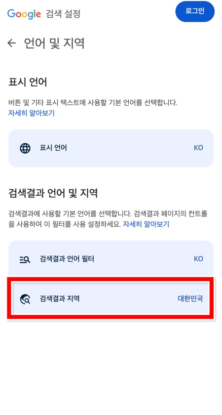 5. '언어 및 지역' 화면에서는 검색 결과의 지역을 바꿀 수 있습니다. 현재 '대한민국'으로 되어있는 '검색결과 지역' 부분을 눌러주세요.