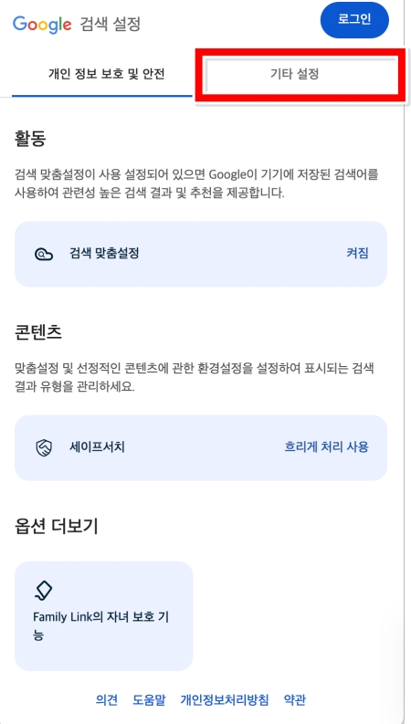 3. 검색 설정 페이지로 바뀌면 화면 왼쪽에서 '기타 설정'이라는 항목을 찾아 선택합니다.