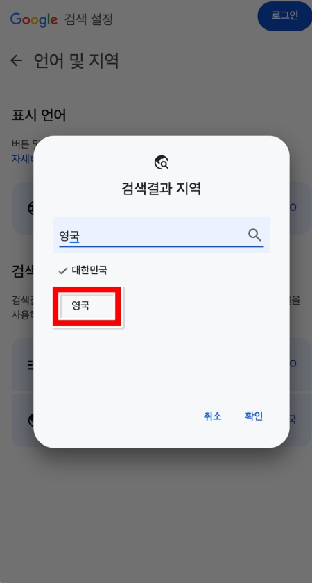 6. 작은 창이 뜨면 검색하는 곳에 '영국'이라고 입력해 주세요. 아래에 나타나는 '영국' 항목을 선택하면 됩니다.