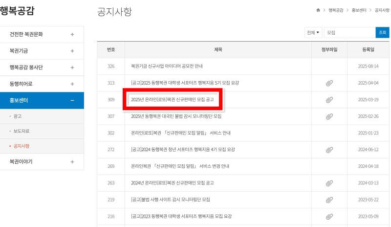 4. 검색창에 '모집'과 같은 핵심 단어를 입력하고 조회하면 관련 공고 목록을 확인할 수 있습니다. '2025년 온라인(로또)복권 신규판매인 모집 공고'를 선택합니다.