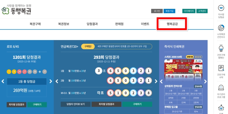 1. 동행복권 홈페이지 상단 메뉴에서 '행복공감'을 찾아 들어갑니다. 이곳에서는 복권과 관련된 다양한 소식과 정보를 확인할 수 있어 유용합니다.