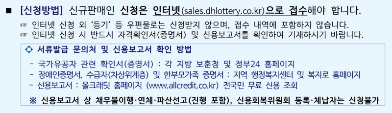 7. 신규 판매인 신청은 지정된 인터넷 주소(sales.dhlottery.co.kr)를 통해서만 접수할 수 있습니다. 우편이나 다른 방법으로는 접수가 불가능하니 유의해야 합니다.